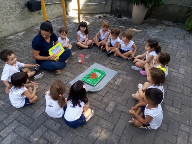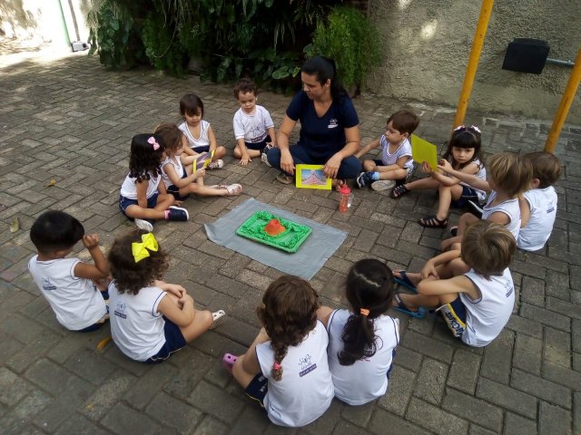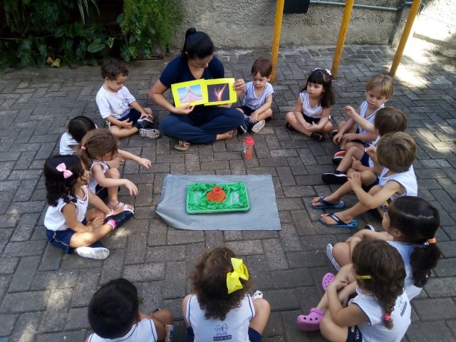 Adaptando a sua linguagem para a faixa etária, ela conversou sobre a figura de uma montanha que, por muitos fatores geológicos podem expelir um material magmático e também muitos gases.