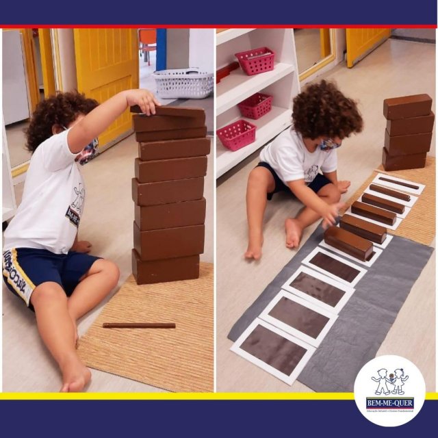 "Nada está na inteligência sem que antes tenha passado pelos sentidos", afirmava o filósofo Aristóteles. Maria Montessori desenvolveu diversos materiais para trabalhar o que ela chamou de Educação sensorial. A escada marrom e a torre rosa, são clássicos desse material Montessoriano, que levam a criança a construir, sentir, refletir e criar. Nos dois materiais a criança trabalha a forma e desenvolve conceitos de grosso, fino, mais grosso e mais fino, grande, pequeno, maior, menor. De forma concreta vai sendo feita a preparação indireta para conceitos de geometria plana e volume.